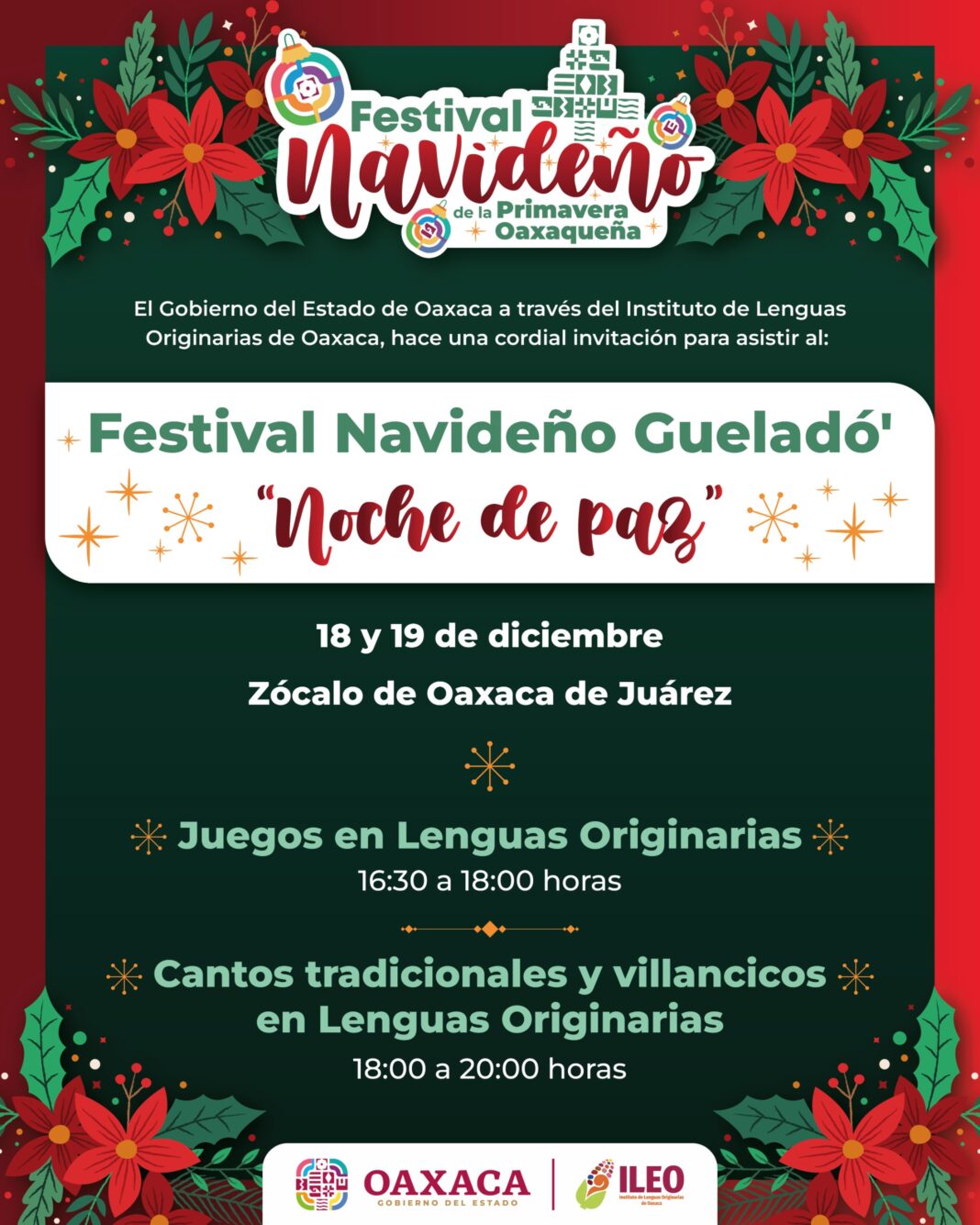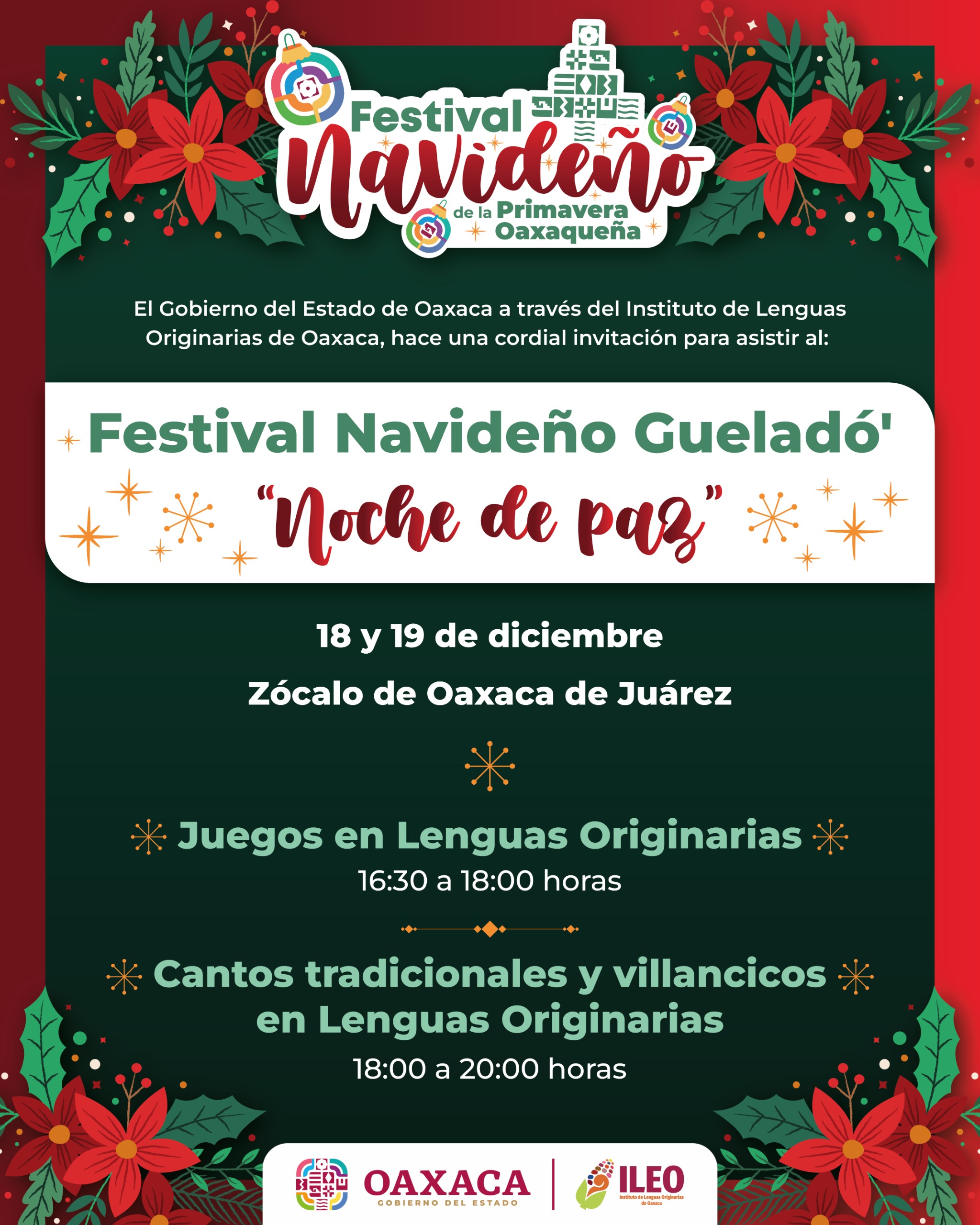 Oaxaca de Juárez, Oax., 16 de diciembre de 2025.- El Instituto de Lenguas Originarias de Oaxaca (ILEO) invita a la población a disfrutar del Festival Navideño Gueladó’ “Noche de Paz”, que se realizará este 18 y 19 de diciembre en el Zócalo de la capital del estado, frente al Palacio de Gobierno, a las 16:30 horas.