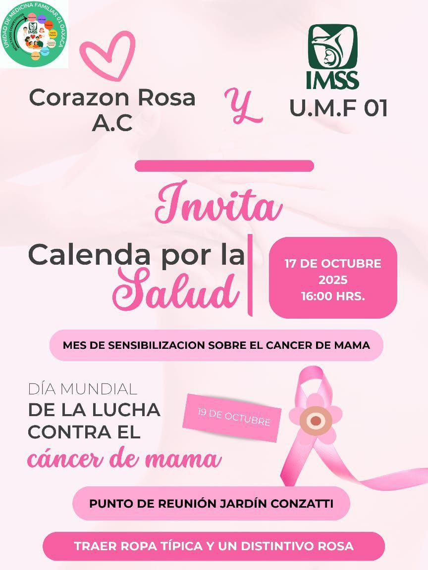 Asimismo, se invita a la población en general a sumarse a la “Calenda por la salud”, que partirá del Jardín Conzatti, ubicado frente a la UMF No. 1 a las 16:00 horas, portando alguna prenda o distintivo rosa como símbolo de solidaridad en la lucha contra el cáncer de mama.