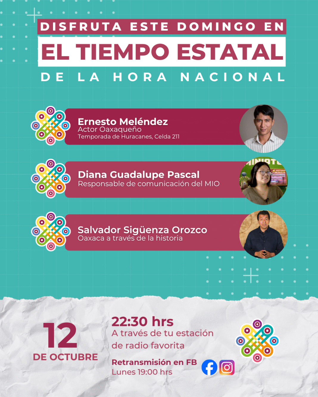 Oaxaca de Juárez, Oax., 11 octubre de 2025.- El Gobierno de Oaxaca invita a la población a sintonizar este domingo 12 de octubre, una emisión especial del programa radiofónico El Tiempo Estatal de la Hora Nacional dedicada a celebrar la cultura, el talento y la historia de Oaxaca.