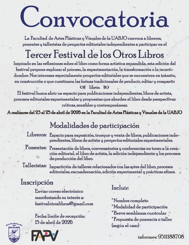 La Facultad de Artes Plásticas y Visuales convoca a libreros, ponentes y talleristas de proyectos editoriales a participar en el “Tercer Festival de los Otros Libros”, que se realizará del 23 al 25 de Abril en la Facultad de Artes Plásticas y Visuales.