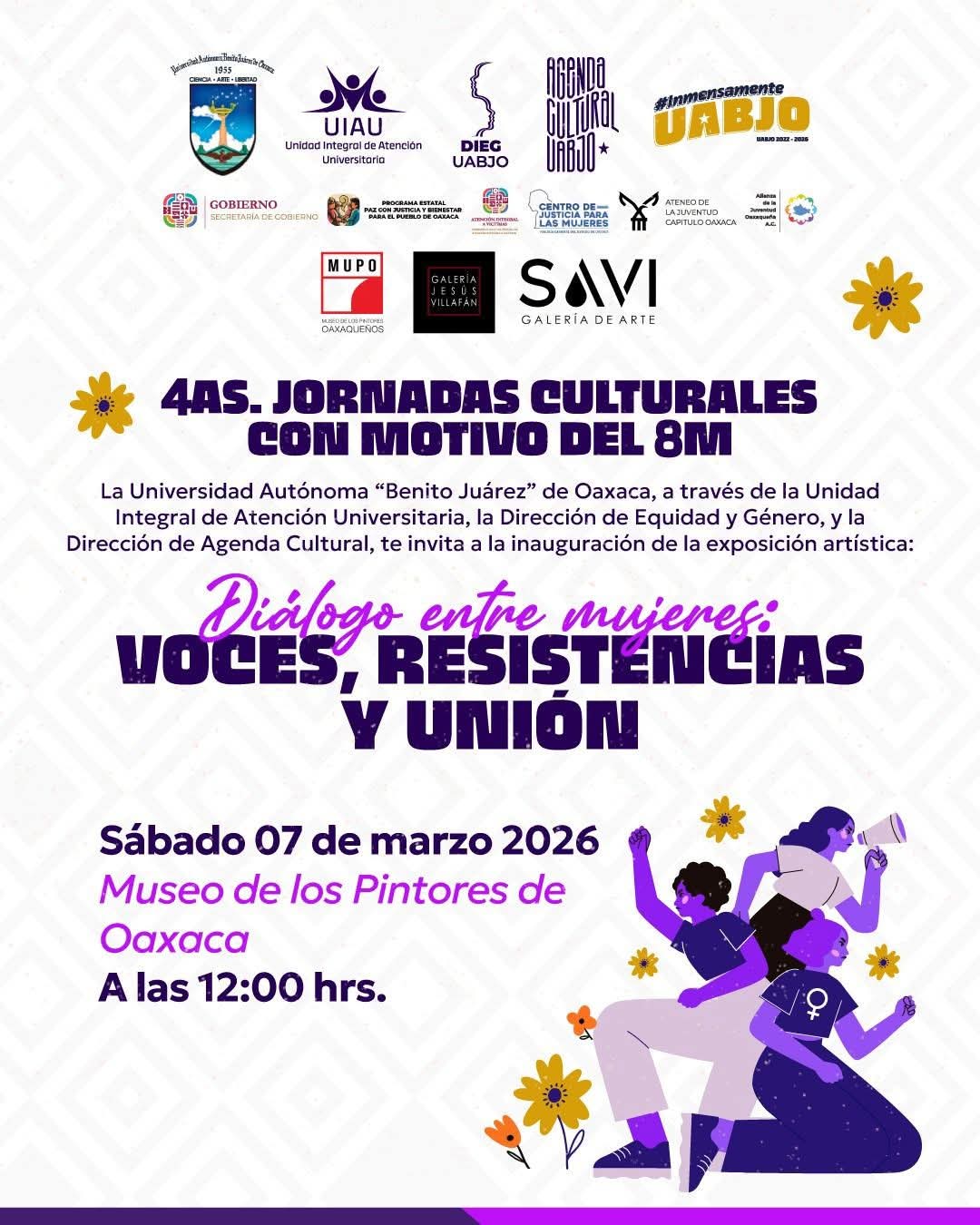 La UABJO les invita a la inauguración artística “Diálogo entre mujeres: Voces, resistencias y unión, este 07 de Marzo a las 12:00 pm en el Museo de los Pintores de Oaxaca.