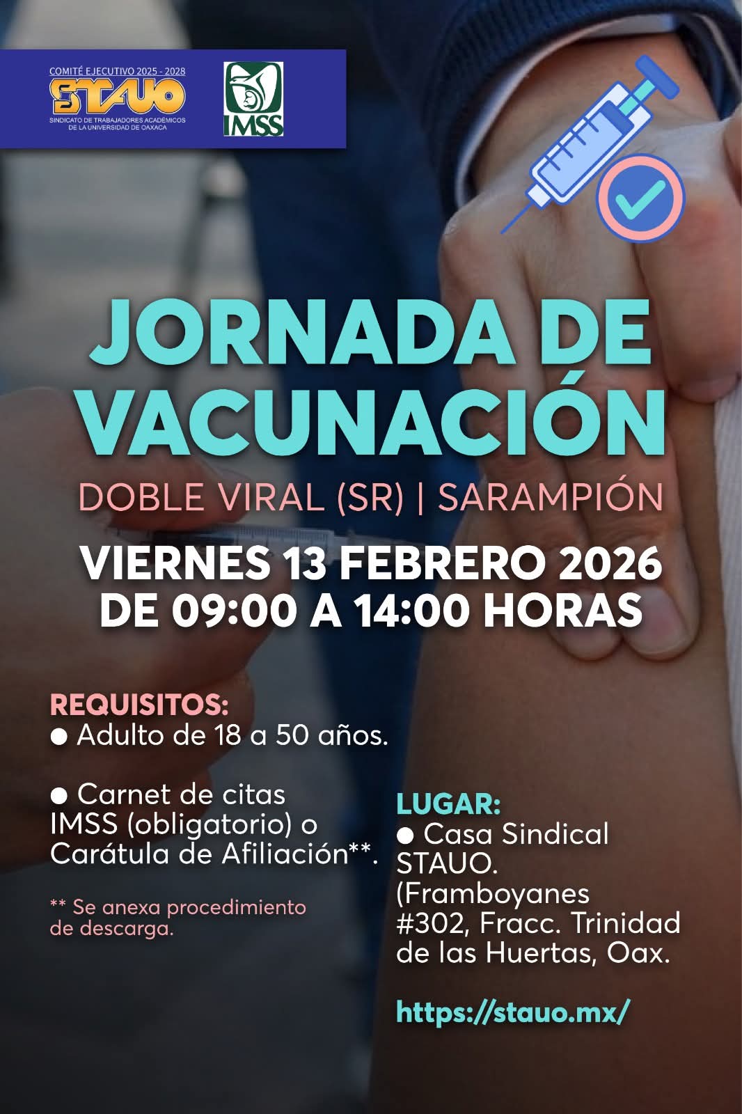 USBJO les invita a participar en la Jornada de Vacunación doble virar (sr) Sarampión el próximo 13 de febrero de 9:00 am a 2:00 pm en la Casa Sindical STAUO.