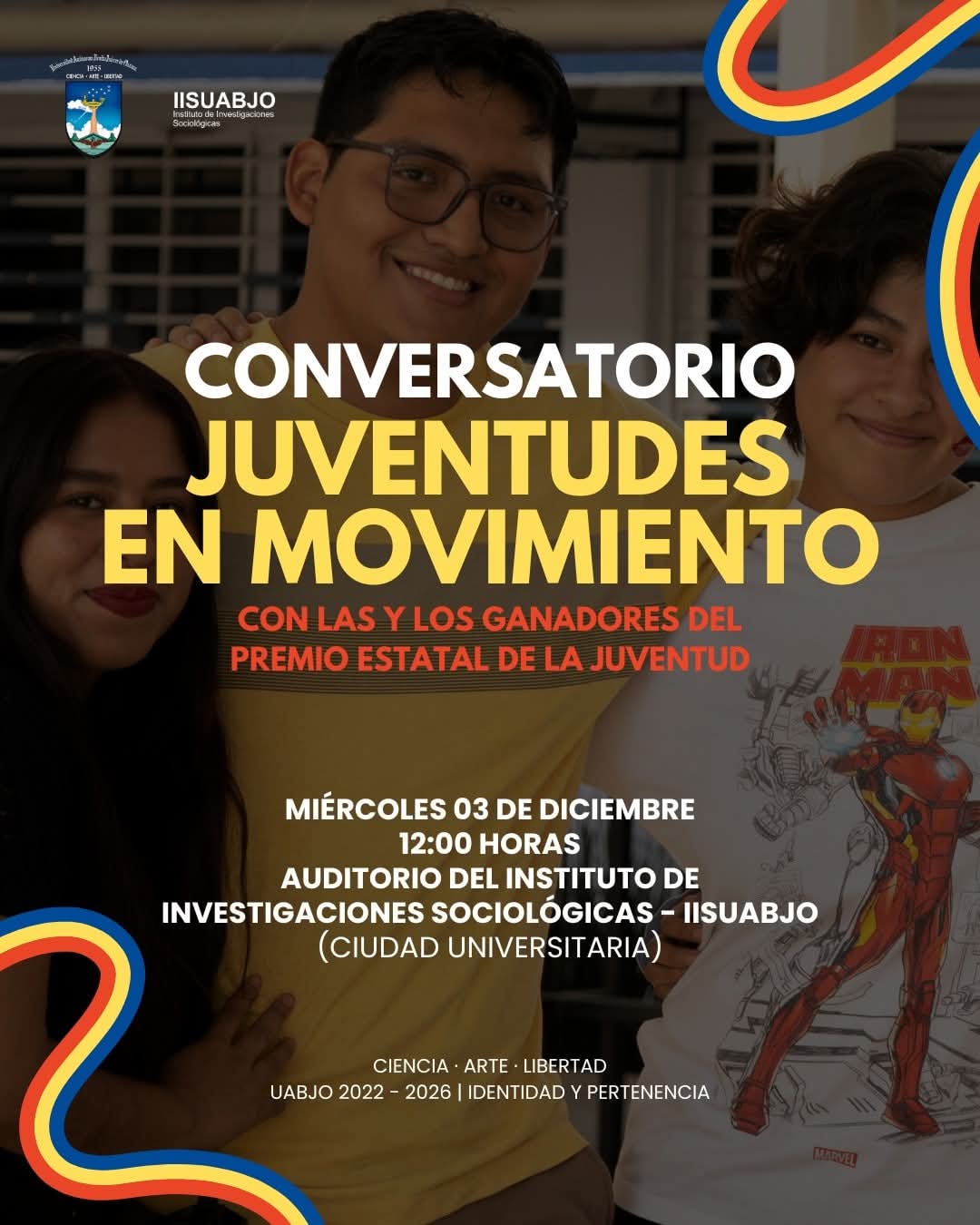 La UABJO les invita a formar parte del conversatorio “Juventudes en Movimiento” con las y los ganadores del Premio Estatal de la Juventud. Se llevará a cabo este 3 de Diciembre a las 12:00 pm en el Auditorio del Instituto de Investigaciones Sociológicas (IISUABJO)
