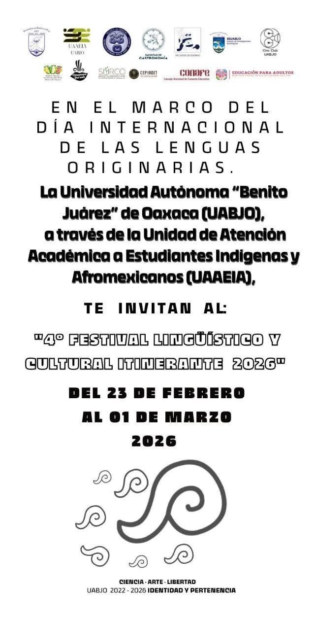 La Universidad Autónoma “Benito Juárez” de Oaxaca, a través de la Unidad de Atención Académica a Estudiantes Indígenas y Afromexicanos (UAAEIA), les invita a ser parte del 4° Festival Lingüístico y Cultural Itinerante 2026, del 23 de febrero al 01 de marzo.