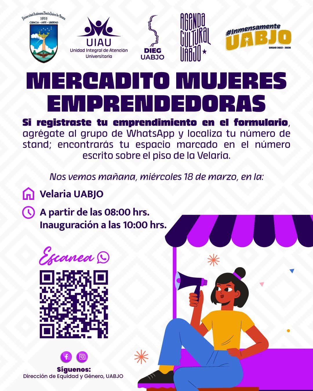 A partir de las 8:00 am los esperamos en la Velaria UABJO para dar inicio al Mercadito “Mujeres emprendedoras”.