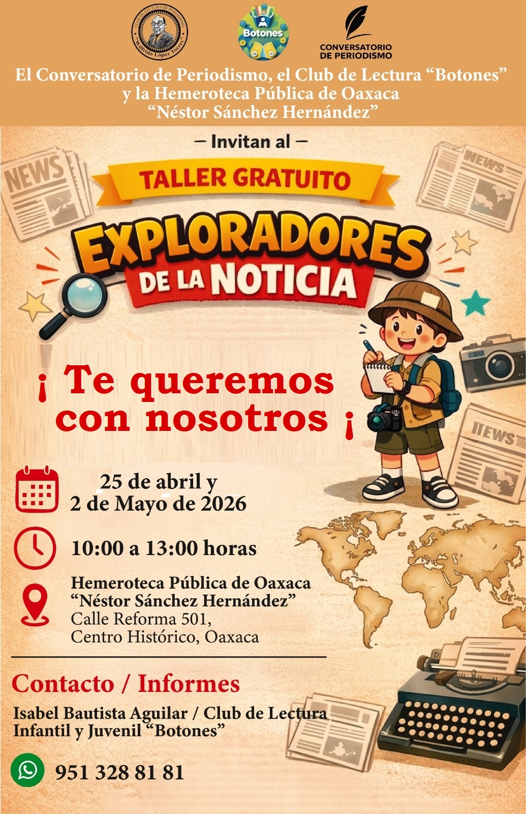 El Conversatorio de Periodismo, el Club de Lectura Infantil y Juvenil “Botones” y la Hemeroteca Pública de Oaxaca “Néstor Sánchez Hernández” invitan a participar en la segunda sesión del taller infantil y juvenil “Exploradores de la Noticia”, que se realizará el próximo sábado 25 de abril.
