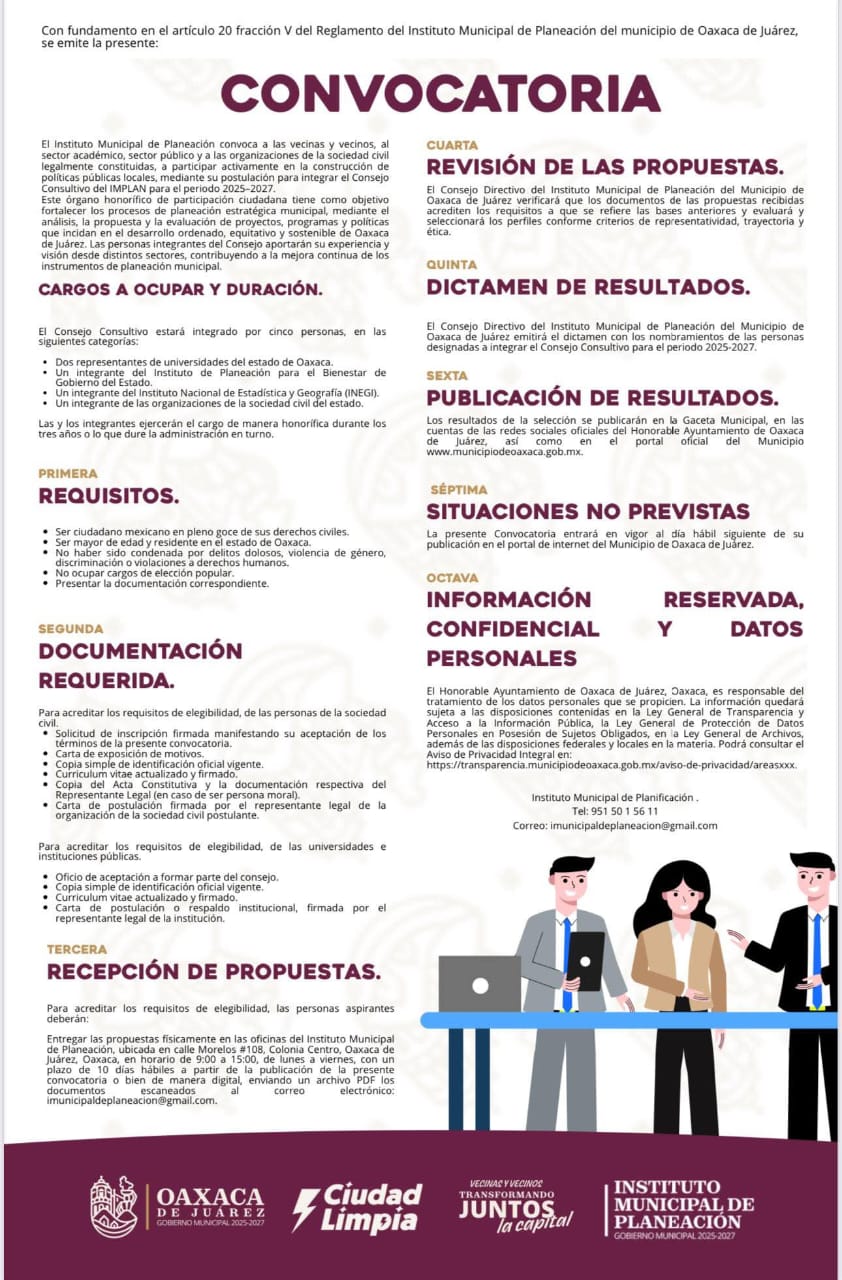 Oaxaca de Juárez, Oax., 15 de octubre de 2025.–El Instituto Municipal de Planeación (IMPLAN) de Oaxaca de Juárez invita a vecinas, vecinos, universidades, organizaciones de la sociedad civil y al sector público a participar en la integración del Consejo Consultivo Temático 2025–2027, un órgano que fortalecerá la participación ciudadana en la construcción de políticas públicas locales.