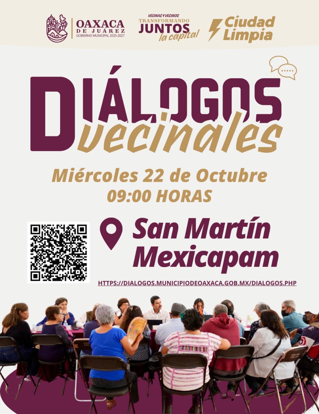 Oaxaca de Juárez, Oax., 21 de octubre de 2025.– El Gobierno Municipal de Oaxaca de Juárez, que encabeza el presidente Ray Chagoya, invita a las vecinas y vecinos de San Martín Mexicapam a participar en los Diálogos Vecinales, un espacio de encuentro directo entre ciudadanía y autoridades municipales, donde se escuchan necesidades, se atienden planteamientos y se construyen soluciones conjuntas.