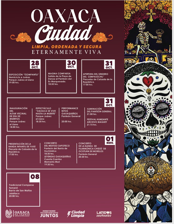 Bajo el lema “Oaxaca Ciudad: limpia, ordenada y segura, eternamente viva”, la Secretaría de Turismo Municipal dio a conocer una programación cultural que se desarrollará del 28 de octubre al 8 de noviembre, con actividades que llenarán de color, música y misticismo las calles, plazas y panteones de la ciudad.