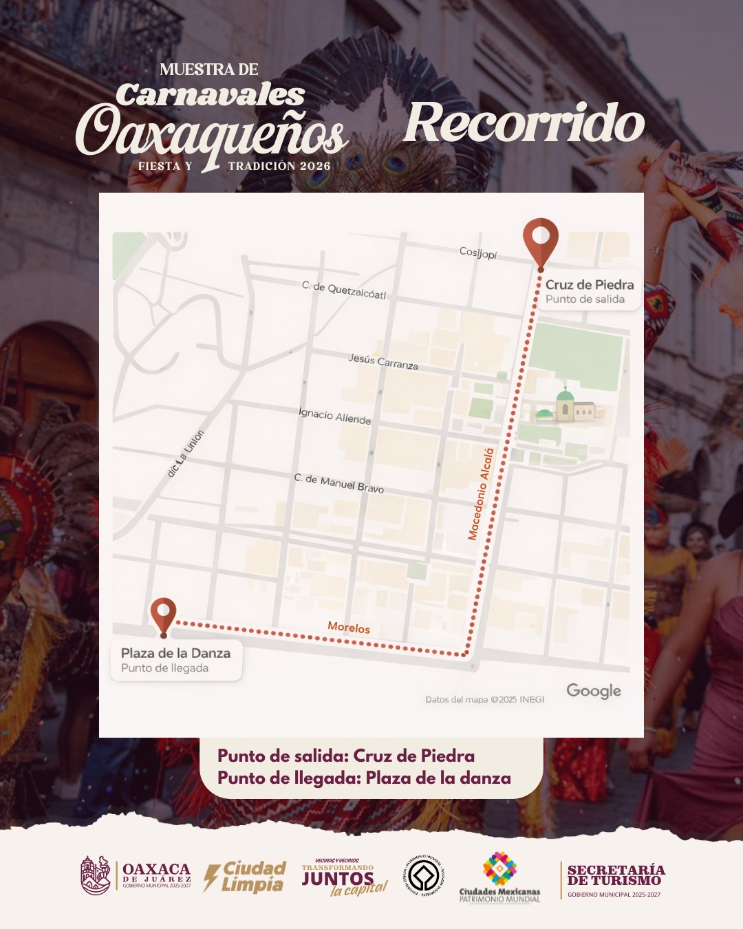 Oaxaca de Juárez, Oax., 13 de febrero de 2026.– El Municipio de Oaxaca de Juárez invita a vecinas, vecinos y visitantes a disfrutar de la Muestra de Carnavales Oaxaqueños, una celebración que reúne expresiones emblemáticas de diversas comunidades del estado en un solo escenario, actividad que iniciará hoy viernes a las 5 de la tarde de la Cruz de Piedra a la Plaza de la Danza, recorriendo las calles de Alcalá y Morelos.