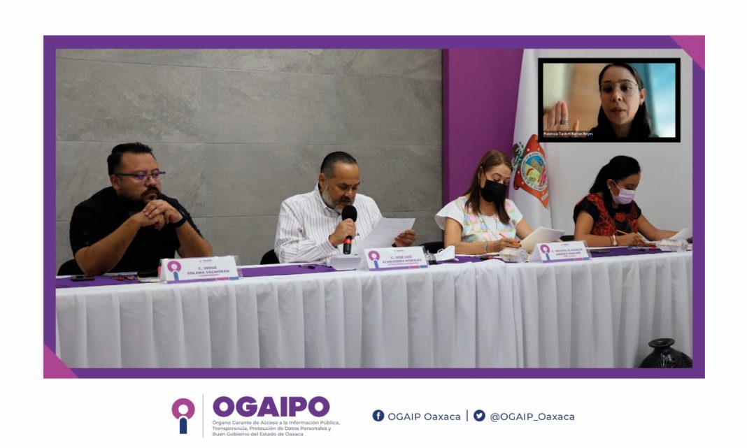 Oaxaca de Juárez, Oax., 14 de julio de 2022.- El Pleno del Órgano Garante de Acceso a la Información Pública, Transparencia, Protección de Datos Personales y Buen Gobierno del Estado de Oaxaca (OGAIPO) celebró su Séptima Sesión Extraordinaria 2022. Dicha sesión contó con la participación del Comisionado Presidente José Luis Echeverría Morales, las Comisionadas, María Tanivet Ramos Reyes, Xóchitl Elizabeth Méndez Sánchez, Claudia Ivette Soto Pineda y el Comisionado Josué Solana Salmorán.