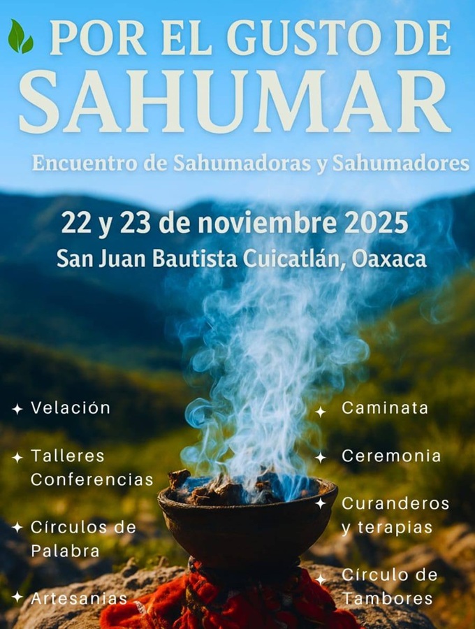 San Juan Bautista Cuicatlán, Oax., 16 de octubre de 2025.- El Gobierno del Estado de Oaxaca informa que las y los médicos tradicionales de la región Sierra de Flores Magón llevarán a cabo el Encuentro “Por el Gusto de Sahumar”, este 22 y 23 de noviembre, para celebrar la herencia espiritual y cultural de los pueblos originarios.