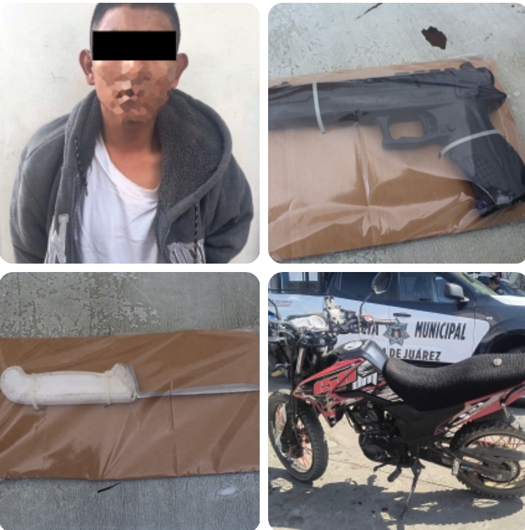 Oaxaca de Juárez, Oax., 18 de enero de 2026.- Personal de la Secretaría de Seguridad Vecinal efectuó la detención de una persona al ser sorprendida en posesión de un cuchillo y una pistola de utilería en las inmediaciones de la agencia municipal de Montoya.