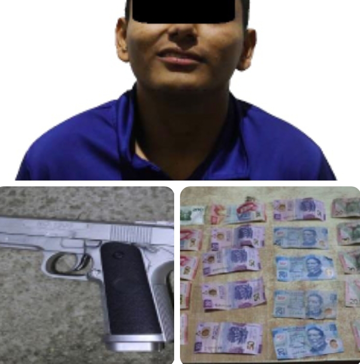 • Le aseguran un arma de fuego tipo réplica y el dinero producto del robo