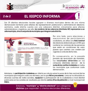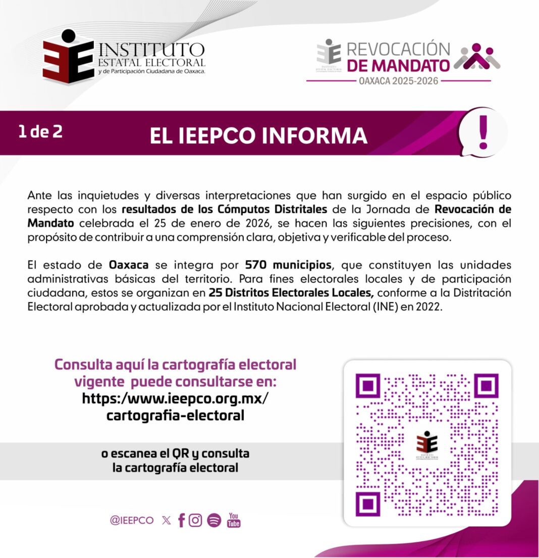 Inicio Estatal Precisiones del IEEPCO sobre los cómputos distritales del Proceso de #RevocaciónDeMandato en... Estatal Precisiones del IEEPCO sobre los cómputos distritales del Proceso de #RevocaciónDeMandato en #Oaxaca enero 27, 2026 149 Compartir Comparte esto: Share on X (Se abre en una ventana nueva) X Comparte en Facebook (Se abre en una ventana nueva) Facebook Me gusta esto:Me gusta Cargando... Artículos relacionadosMás del autor Con la meta de 1.8 millones de viviendas estamos construyendo bienestar: Presidenta encabeza entrega de viviendas en Juárez, Nuevo León La Dirección de Protección Civil Municipal de Oaxaca de Juárez activó de inmediato sus protocolos de revisión y monitoreo tras sismo La Dirección de Protección Civil y la Secretaría de Seguridad Vecinal informan