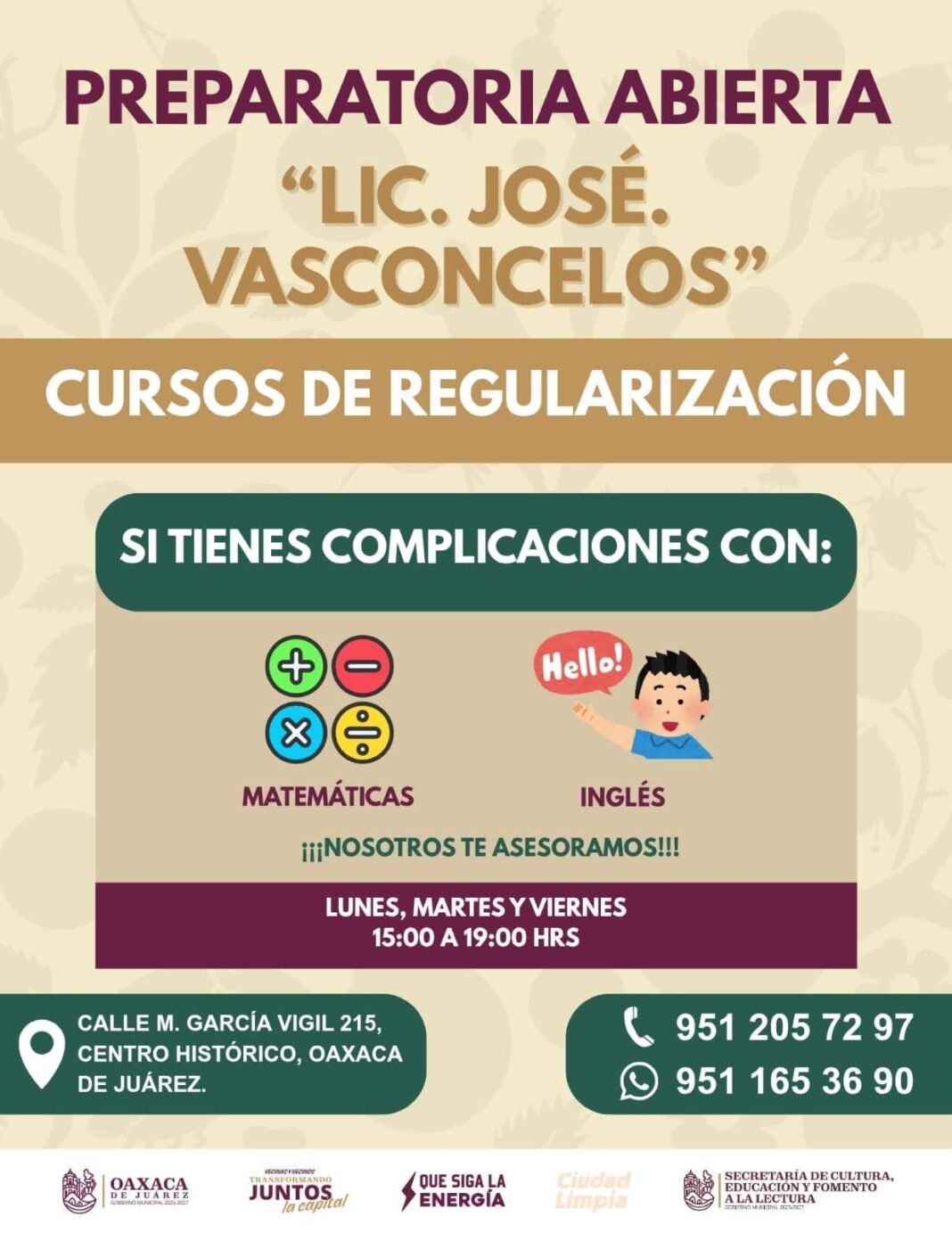 Oaxaca de Juárez, Oax. 26 de septiembre de 2025.- El Municipio de Oaxaca de Juárez, a través de la Secretaría de Cultura, Educación y Fomento a la Lectura, informa que se encuentran abiertas las inscripciones todo el año en la Preparatoria Abierta “José Vasconcelos”, ubicada en el Centro Histórico de la capital.