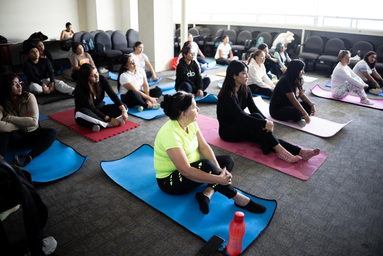El funcionariado aprendió diversas técnicas de respiración, estiramientos y movimientos corporales, tanto de pie como recostados, orientados a reducir la carga emocional y física acumuladas durante las jornadas de trabajo.