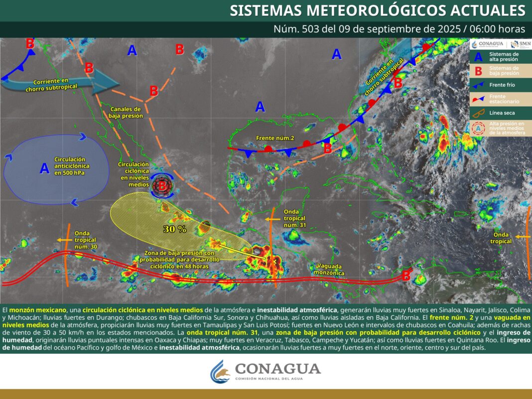 Oaxaca de Juárez, Oax. 9 de septiembre de 2025.- La Coordinación Estatal de Protección Civil y Gestión de Riesgos (CEPCyGR) informa que se esperan áreas de chubascos y tormentas en la entidad, con mayor intensidad en las regiones Sierra Sur, Cuenca del Papaloapan y algunos sectores del Istmo de Tehuantepec.