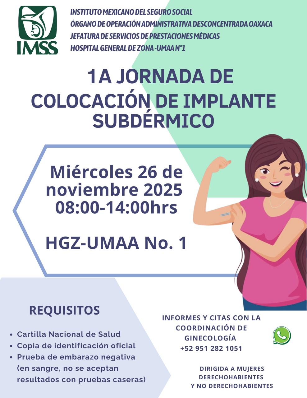 El Instituto Mexicano del Seguro Social (IMSS) en Oaxaca invita a mujeres derechohabientes y no derechohabientes a participar en la 1ª Jornada de Colocación de Implante Subdérmico, que se llevará a cabo el miércoles 26 de noviembre de 2025, en un horario de 08:00 a 14:00 horas, en el Hospital General de Zona (HGZ), Unidad Médica de Atención Ambulatoria (UMAA) No. 1.
