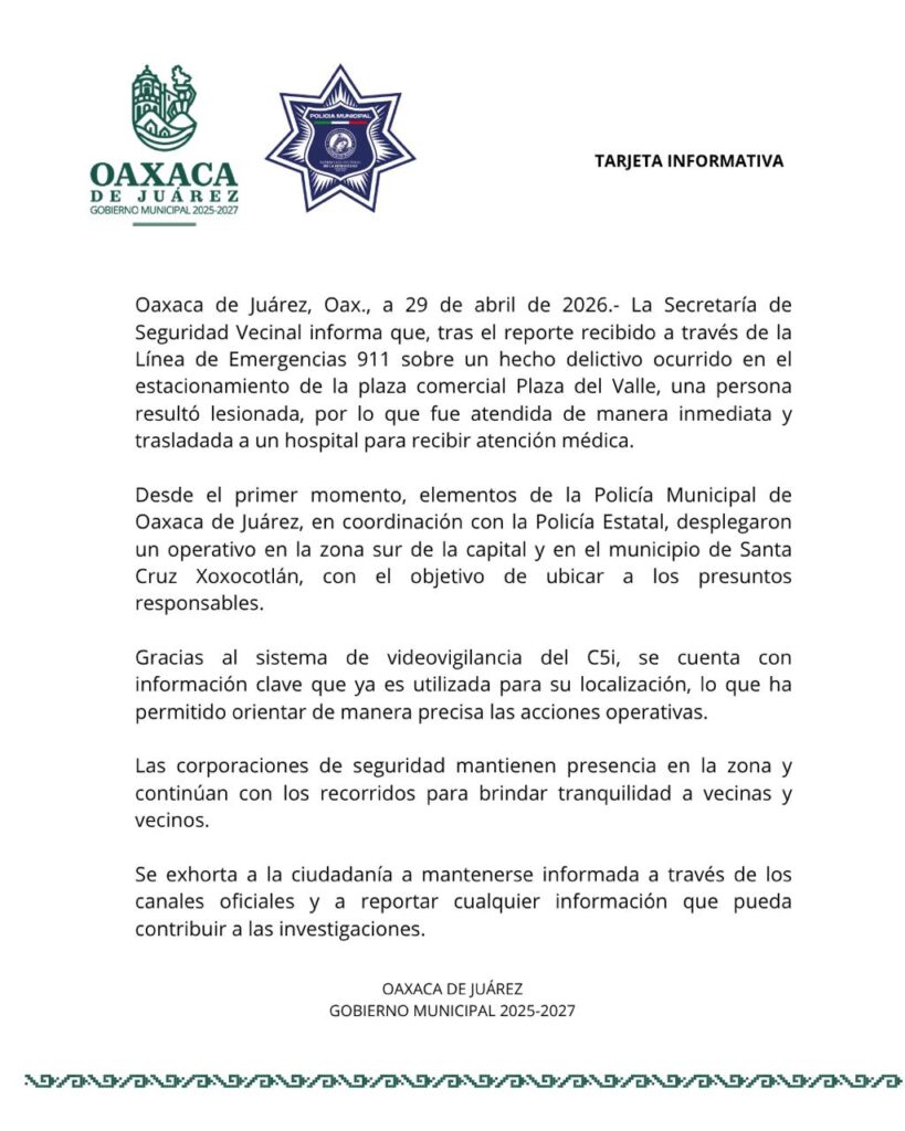Inicio Estatal Tarjeta Informativa Estatal Tarjeta Informativa abril 29, 2026 94 Compartir Comparte esto: Share on X (Se abre en una ventana nueva) X Comparte en Facebook (Se abre en una ventana nueva) Facebook Me gusta esto:Me gusta Cargando... Artículos relacionadosMás del autor Plan México: Presidenta Claudia Sheinbaum firma Acuerdo histórico para el Fomento de la Industria Siderúrgica Mexicana Acuerdan mayor difusión turística para Oaxaca de Juárez Disminuye percepción de inseguridad en Oaxaca de Juárez gracias al trabajo coordinado del Gobierno Municipal
