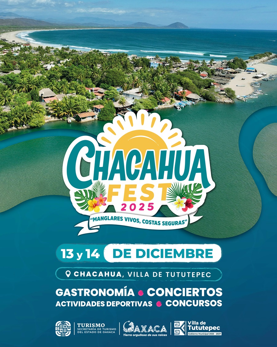 Oaxaca de Juárez, Oax. 11 de diciembre de 2025.- Todo está listo para que visitantes locales, nacionales e internacionales puedan disfrutar de la música, gastronomía, deportes y belleza natural de la Costa en el Chacahua Fest 2025 “Manglares Vivos, Costas Seguras”, los días 13 y 14 de diciembre; informó la Secretaría de Turismo (Sectur Oaxaca).