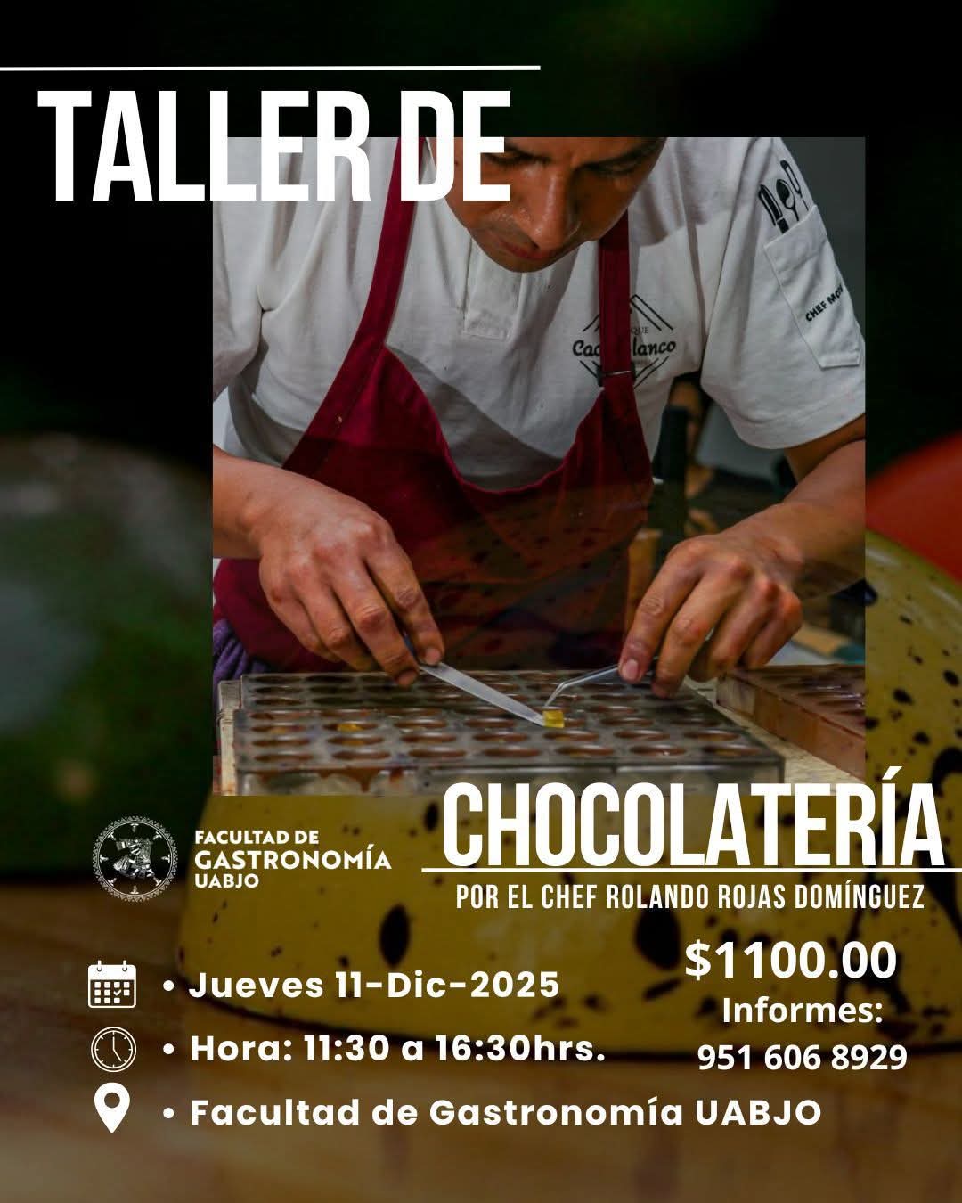 La UABJO les invita a formar parte del taller de chocolatería, llevado a cabo por el chef Rolando Rojas Domínguez, el próximo 11 de Diciembre de 11:30 am a 4:30 pm en la Facultad de Gastronomía. Pueden solicitar más informes a través del número 951 606 8929.