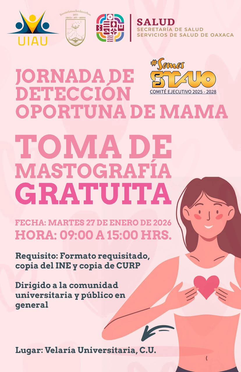 Como parte de la Jornada de Detección Oportuna de Mama, se les invita a la comunidad universitaria y público en general, a la de toma de mastografía gratuita el próximo 27 de enero de 9:00 am a 3:00 pm, en la Velaria Universitaria.