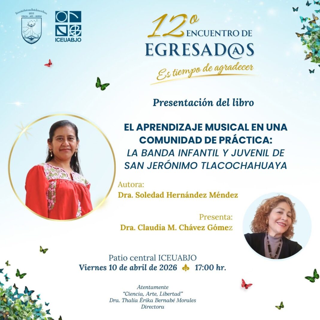 La UABJO invita a toda la Comunidad universitaria a la presentación del libro “El aprendizaje musical en una comunidad de práctica: La banda infantil y juvenil de San Jerónimo Tlacochahuaya”, el próximo 10 de Abril a la 5:00 pm en el patio central del ICEUABJO.