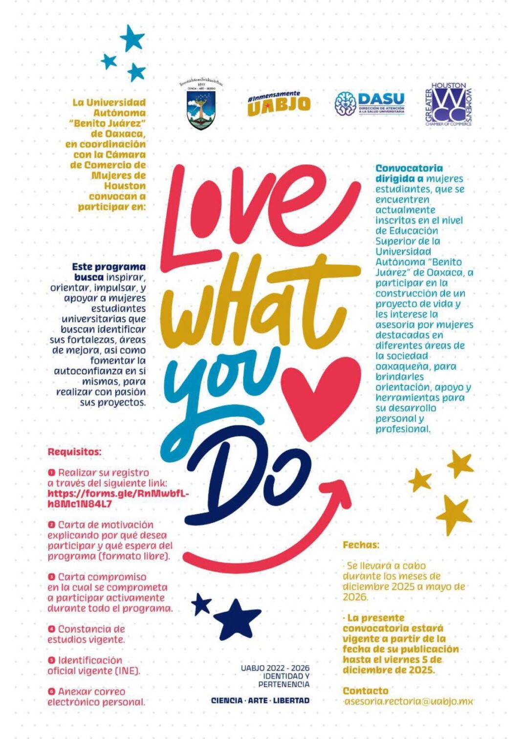 La UABJO les invita a participar en la Convocatoria “Love What you do” un programa que busca inspirar, orientar, impulsar y apoyar a nuestras estudiantes universitarias para realizar con pasión sus proyectos.