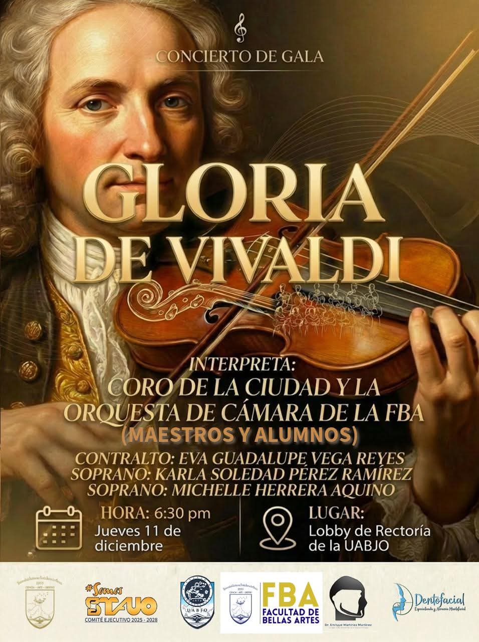 La UBAJO les invita al concierto de gala “Gloria de Vivaldi”, interpretado por el coro de la Ciudad de Oaxaca y la Orquesta de Cámara de la Facultad de Bellas Artes, el día 11 de Diciembre a las 6:30 pm en Lobby de Rectoría.