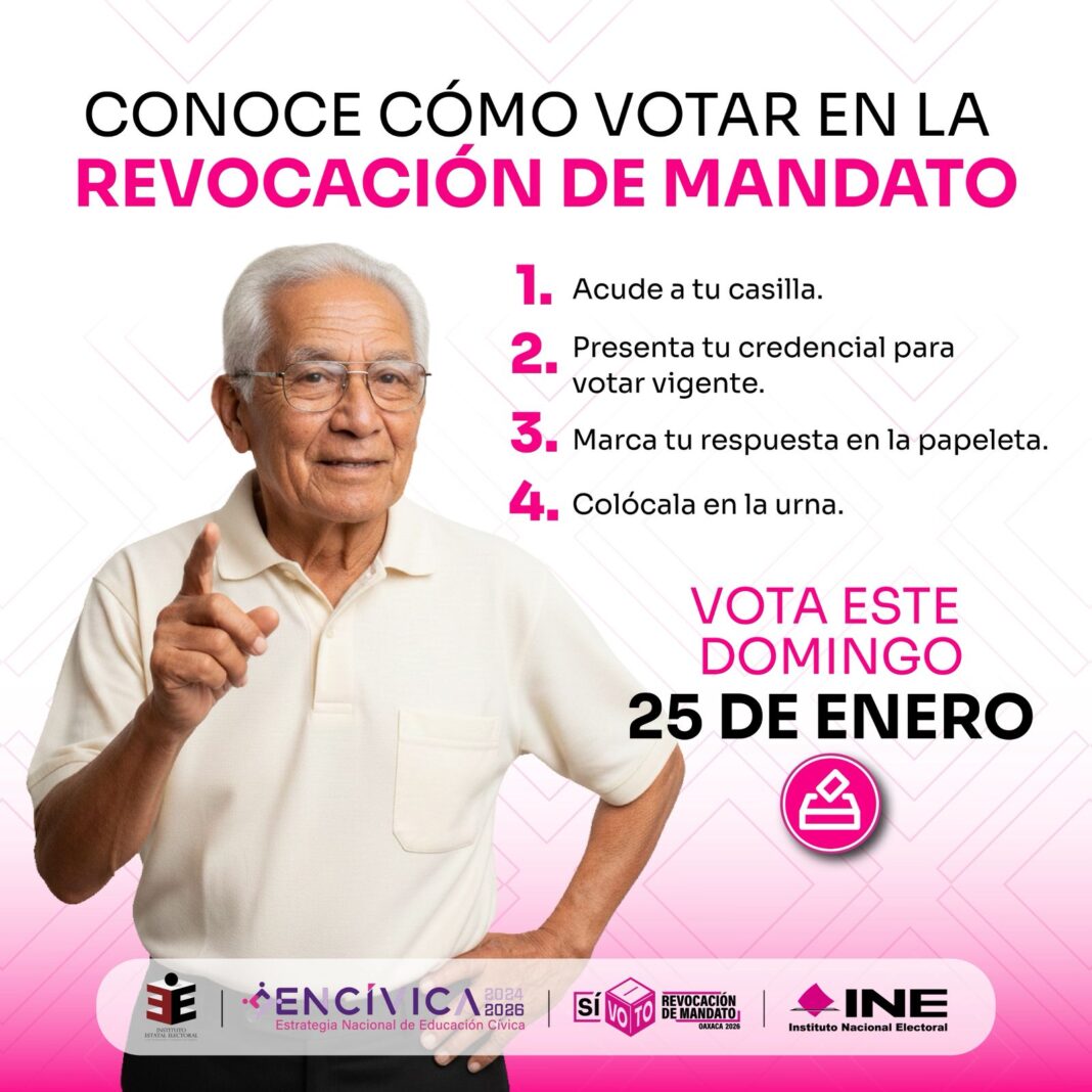 Inicio Estatal Vota el domingo 25 de enero en la #RevocacióndeMandato Estatal Vota el domingo 25 de enero en la #RevocacióndeMandato enero 20, 2026 178 Compartir🗳️Tu participación es libre y secreta, y fortalece la democracia y protege tus derechos. #ParticipaciónPRM_Oaxaca2026 #VotoLibreySecretoRM Comparte esto: Share on X (Se abre en una ventana nueva) X Comparte en Facebook (Se abre en una ventana nueva) Facebook Me gusta esto:Me gusta Cargando... Artículos relacionadosMás del autor Se prepara Oaxaca de Juárez para el Mundial Vecinal 2026 🎉 Así se vivió el arranque de los festejos por el 494 aniversario de Oaxaca de Juárez Promueve IMSS Oaxaca entornos seguros y saludables para niñas y niños