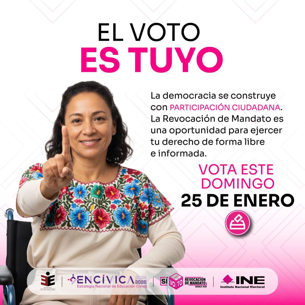 Inicio Estatal Vota el domingo 25 de enero en la #RevocacióndeMandato Estatal Vota el domingo 25 de enero en la #RevocacióndeMandato enero 19, 2026 201 Compartir🗳️Tu participación es libre y secreta. Tu participación fortalece la democracia y protege tus derechos. Vota el domingo 25 de enero en la #RevocacióndeMandato. IEEPCO #ParticipaciónPRM_Oaxaca2026 #VotoLibreySecretoRM Comparte esto: Share on X (Se abre en una ventana nueva) X Comparte en Facebook (Se abre en una ventana nueva) Facebook Me gusta esto:Me gusta Cargando... Artículos relacionadosMás del autor Violencia Digital. La violencia que se organiza en silencio Club Rotario Empresarial Todos Somos Oaxaca: el nacimiento de un compromiso con propósito Se prepara Oaxaca de Juárez para el Mundial Vecinal 2026